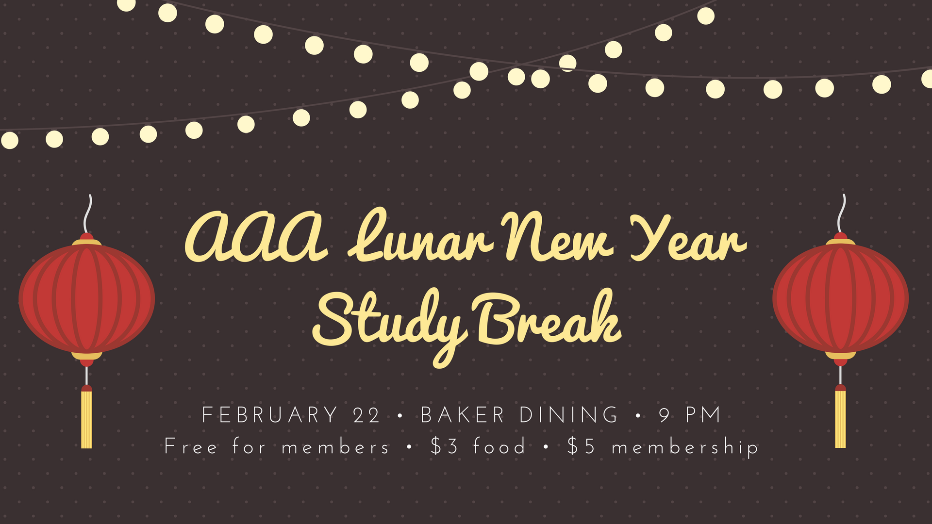 > Come to *AAA's **Lunar New Year Study Break* *tonight* at* 9 PM* in *Baker