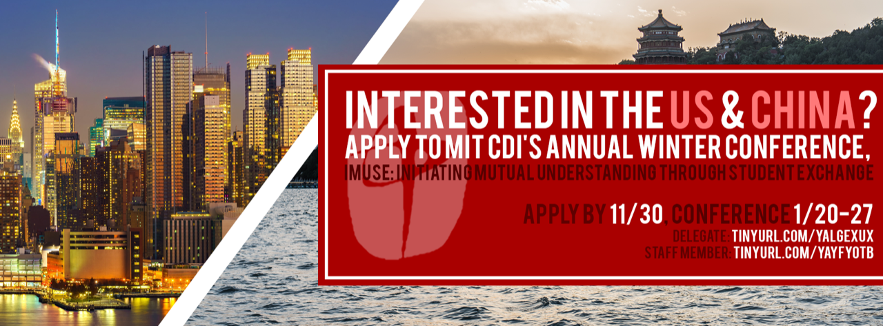 Initiating Mutual Understanding through Student Exchange (IMUSE) is a one-week student-run conference with bi-annual sessions in Beijing, China, and Boston, US. As IMUSE enters its eleventh year, MIT CDI and Harvard IMUSE will be hosting the second IMUSE winter conference this upcoming January, bringing together 30 delegates from top U.S. and Chinese universities: MIT, Harvard, Wellesley, Tsinghua University and Peking University. The theme of this year’s conference is Social Sustainability Through Innovation.