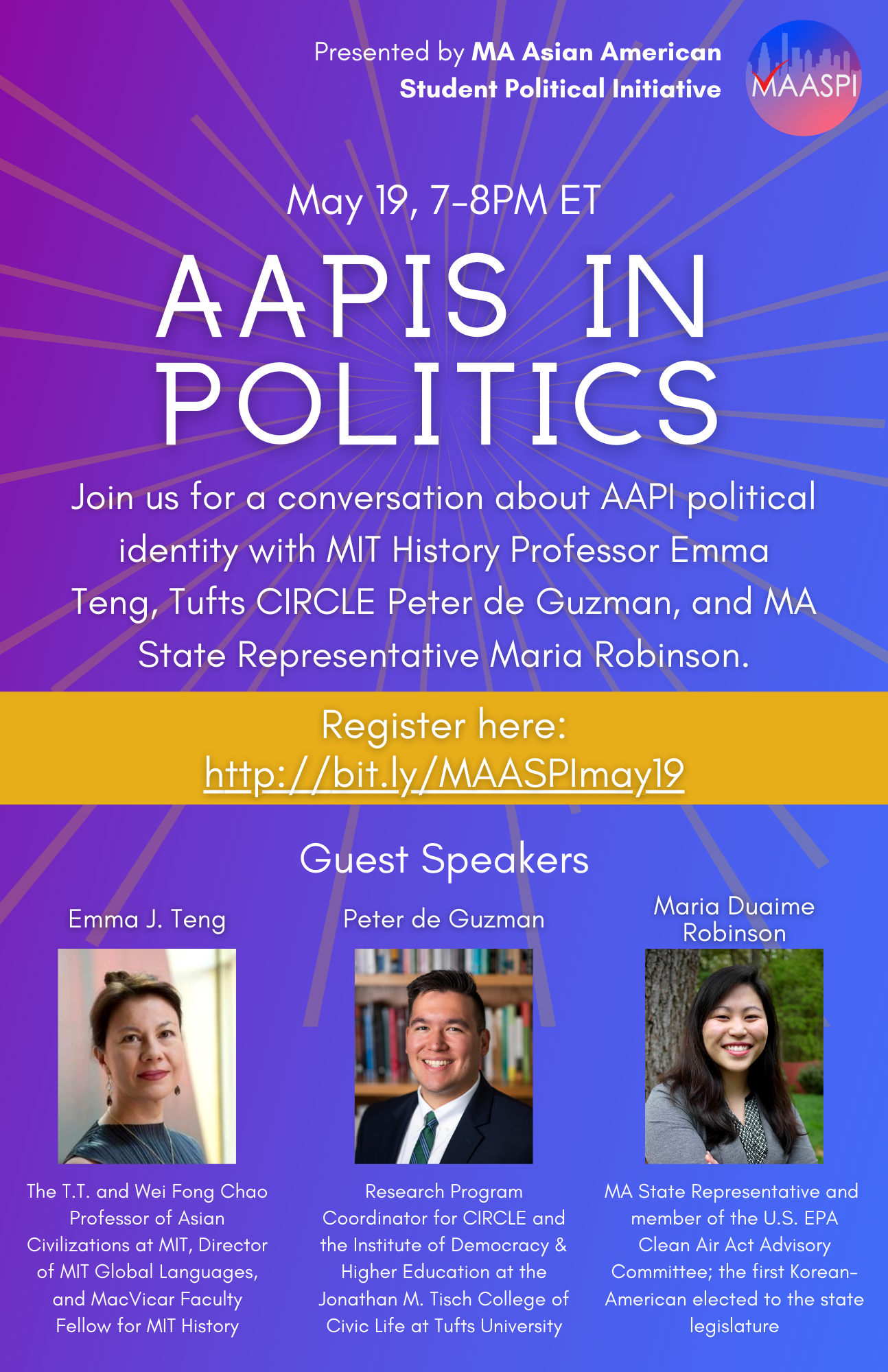 We are hosting an AAPI in Politics virtual event on Wednesday, May 19, 7-8PM. The event is a casual conversation about AAPI political identity with MIT History Professor Emma Teng, Tufts CIRCLE Peter deGuzman, and MA State Representative Maria Robinson. The goal of the event is to hear from different experts in the field of politics and the Asian American experience and mobilize AAPI youth to be politically active.