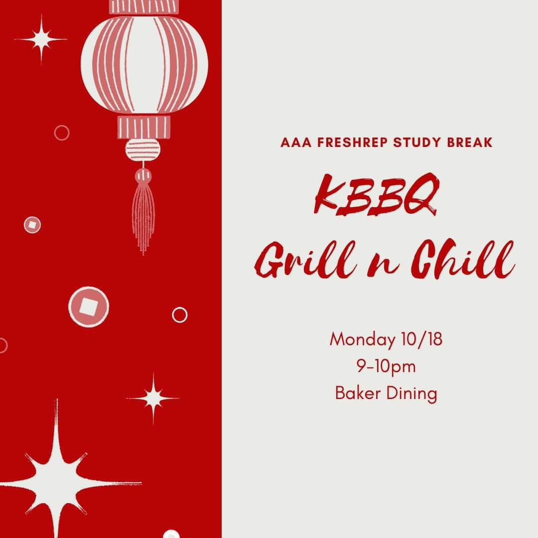 Come to freshrep study break on Monday 10/18 from 9-10PM at Baker Dining! We are serving KBBQ and side dishes, so come eat good food and hang out with cool AAA exec :)) GET EXCITED!!!!