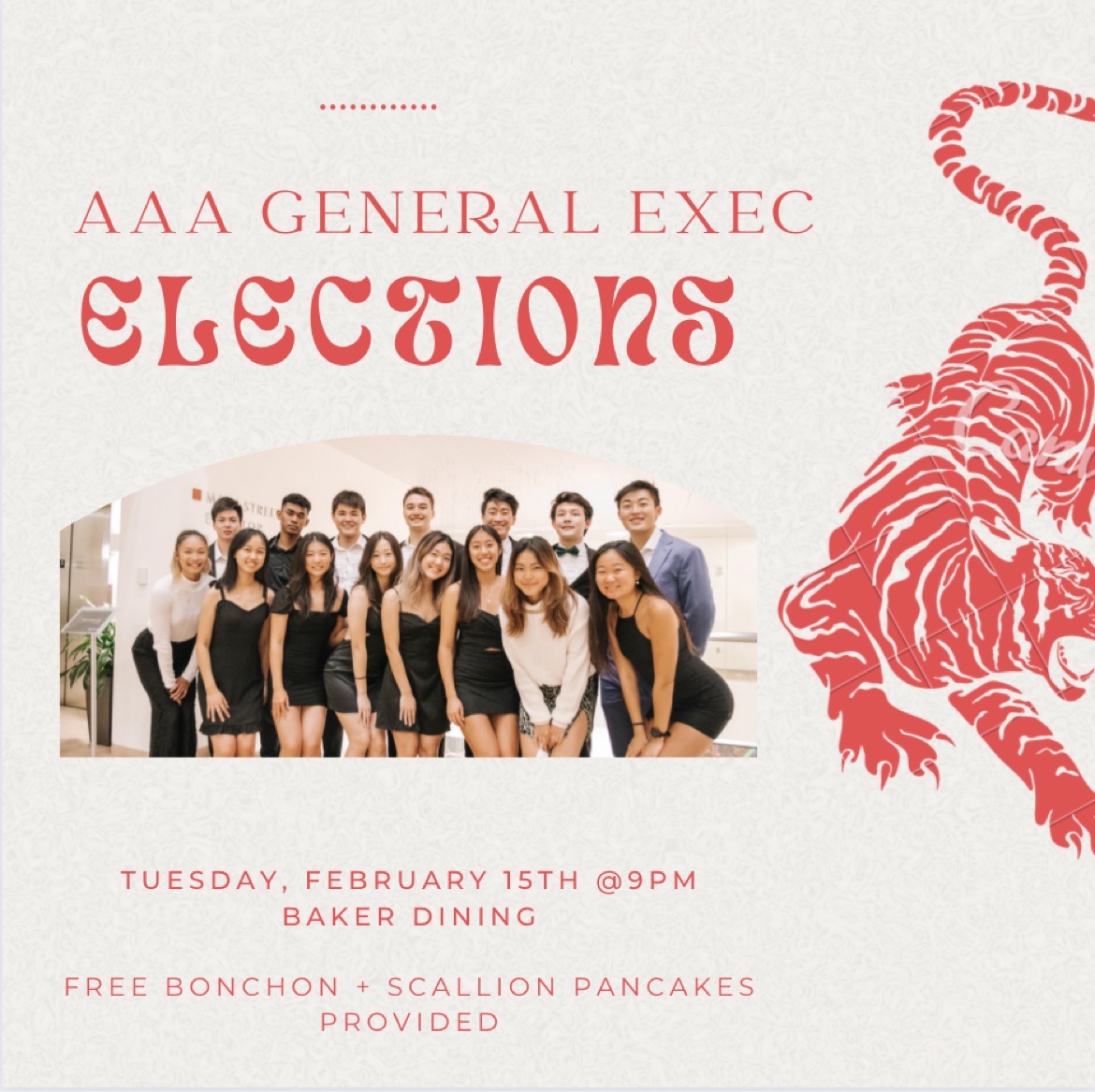 TLDR: AAA General member elections with free bonchon/scallion pancakes tomorrow 2/15 at 9PM in Baker Dining!