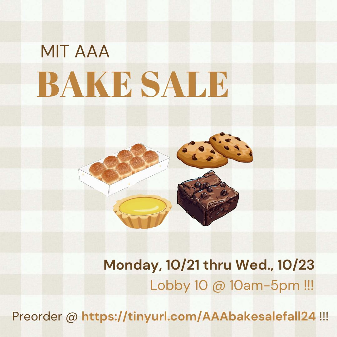 MIT Asian American Association presents ... bAAAke sAAAle!!! We are raising money to support Heart of Dinner, a nonprofit whose mission is to address food insecurity and loneliness among Asian American older adults living in significantly under-resourced and underinvested communities. The featured goods: Monday 10/21: Pumpkin Chocolate Chip Bars 🍫 ($3) Matcha/Hojicha Egg Tarts 🍮 ($1.50) Matcha white chocolate cookies 🍵 ($3) Tuesday 10/22: Black Sesame Brownies🧋($4) Matcha Biscoff Tiramisu 🍵 ($4) Pumpkin Butter Mochi 🎃 ($3) Wednesday 10/23: Gochujang Caramel Cookies 🍯 ($3) Taiwanese Milk Butter Buns 🍞 ($4) Pre-order pick up will happen in Lobby 10 on the above dates from 10 am - 5 pm. Make sure to pick up the baked good on the right date! ALL PROCEEDS GO TO CHARITY!!!! We're so happy to be supporting Heart of Dinner so thank you for helping to be a part in that :)) Please use this form as a preorder and enter the amount of each item you'd like to purchase. Pre-order form closes at 11:59