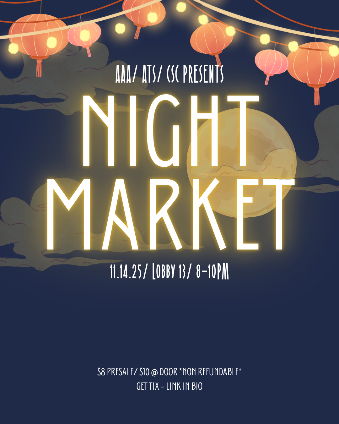 AAA, ATS, and CSC proudly present Nightmarket, a fun-filled event with an amazing lineup of performances, a menu of delicious Asian foods, fun activities to win prizes at each booth, and a great set of MIT clubs to make the night complete - this year with a new carnival theme!