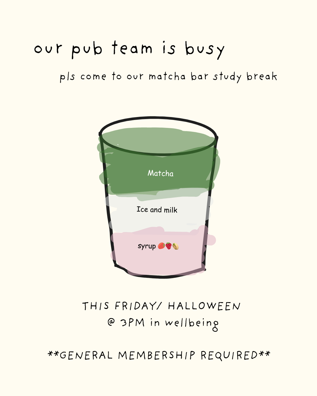 Get excited because AAA is having a MATCHA BAR STUDY BREAK HAPPENING THIS FRIDAY, OCT. 31ST @ 3-5PM IN THE WELLBEING LAB!!