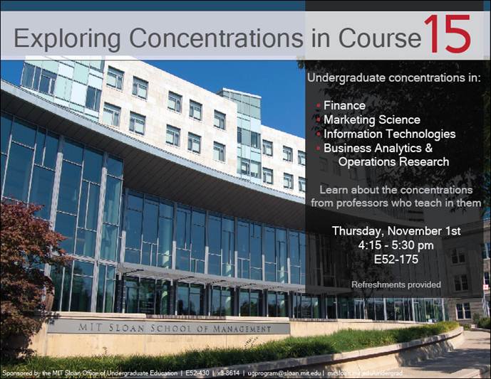 > Each spring we hold an open house event to provide students with an opportunity to learn about the major, and this fall we’d like to introduce a new follow-up event for upperclassmen: Exploring Concentrations in Course 15. This event will be held next Thursday, November 1st from 4:15 to 5:30 pm in E52-175, and will provide information about concentrations in the management science major from instructors who teach in the program. Our agenda is as follows: