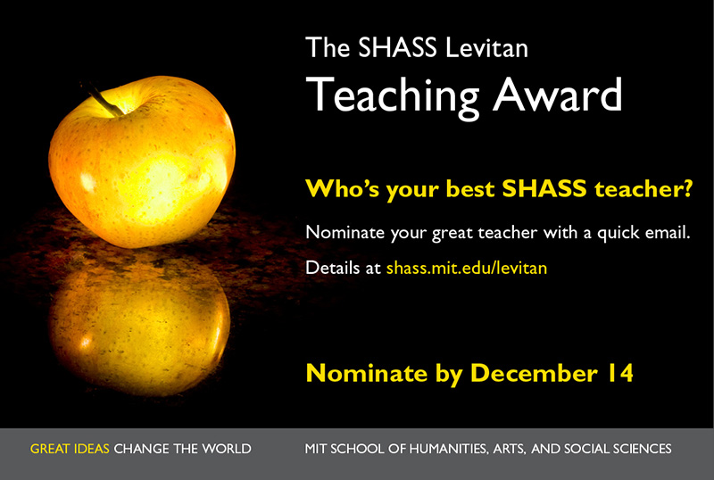 You can reward a great professor, lecturer, or teaching assistant with the James A. and Ruth Levitan Award for Excellence in Teaching. All non-visiting instructors in undergraduate and graduate SHASS subjects are eligible.