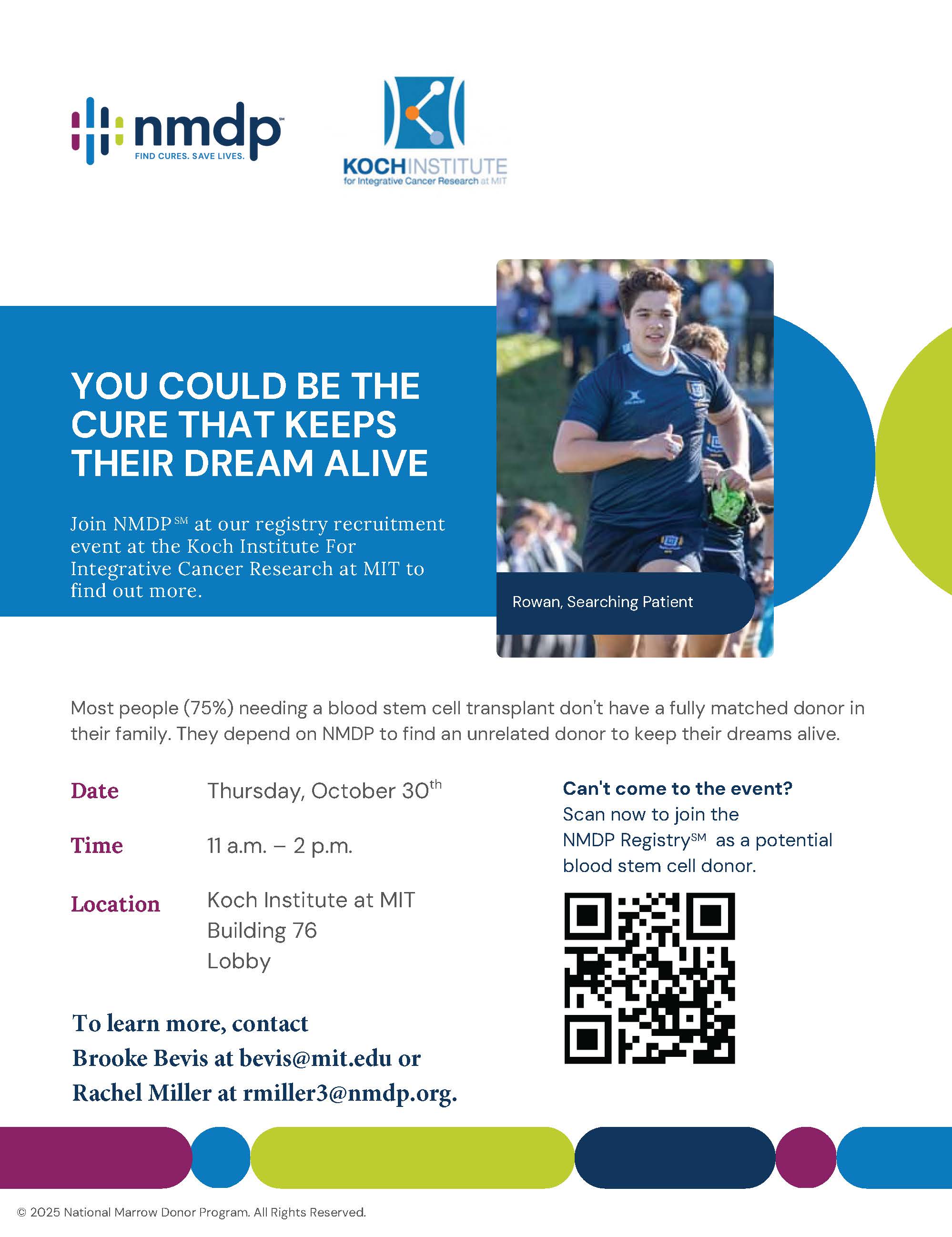 The Koch institute (Building 76) will be holding a Marrow Registry Drive on Thursday, Oct 30, from 11AM-2PM. Please take a few minutes to stop by and learn more about this potential life-saving opportunity!