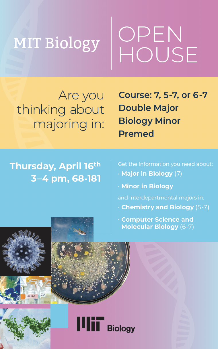 Do you have questions about the program and the different options for studying Biology at MIT? Are you pre-med or thinking about it? Bring your questions and your curiosity to the<https://biology.mit.edu/> <https://biology.mit.edu/> Biology<https://biology.mit.edu/> <https://biology.mit.edu/> Department<https://biology.mit.edu/>’s upcoming OPEN HOUSE event, Thursday, April 16 from 3:00-4:00pm. Biology faculty member, Professor Laurie Boyer, will be on hand to provide a broad overview of the programs offered and address your questions.