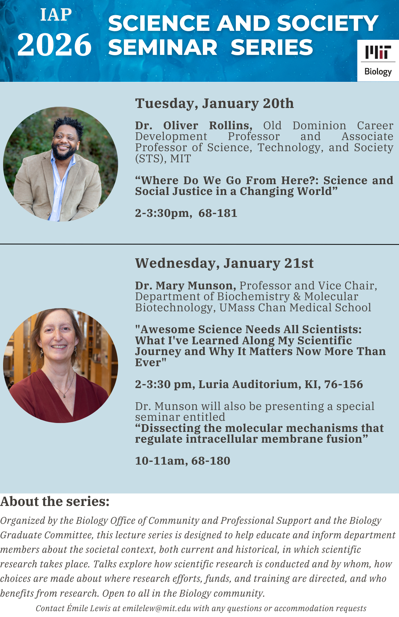 The Biology graduate committee and the Biology Office of Community and Professional Support are pleased to present this year’s Science and Society lectures. We’ve run this series for several years and talks are always excellent. I encourage you to attend to gain a broader perspective on research and its impact on and impact by society. Extended questions and discussion at the end of each talk are encouraged. (Note that the attendance of first-year graduate students is required.)