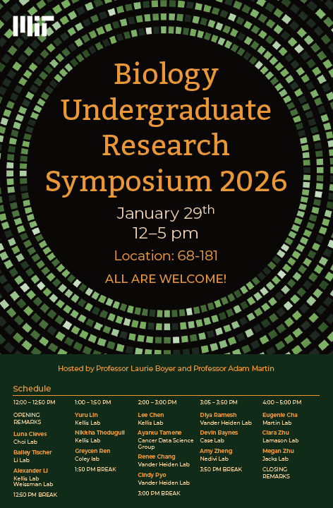 You are invited to attend the annual Biology Undergraduate Research Symposium, Thursday, January 29, from 12:00 to 5:00pm, in 68-181. This year, fifteen students, nominated by their faculty mentors, will be presenting their research from their UROP experiences. The event will take place throughout the afternoon, broken down into five sessions with a short break in between each session.