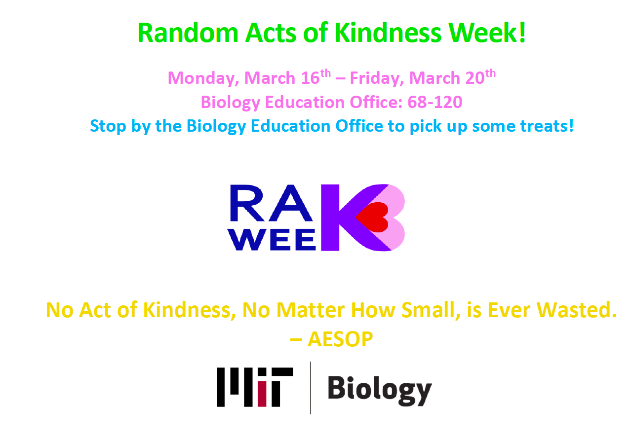 This week is Random Acts of Kindness Week. We welcome you to stop by the Biology Education Office, 68-120, to grab some snacks.