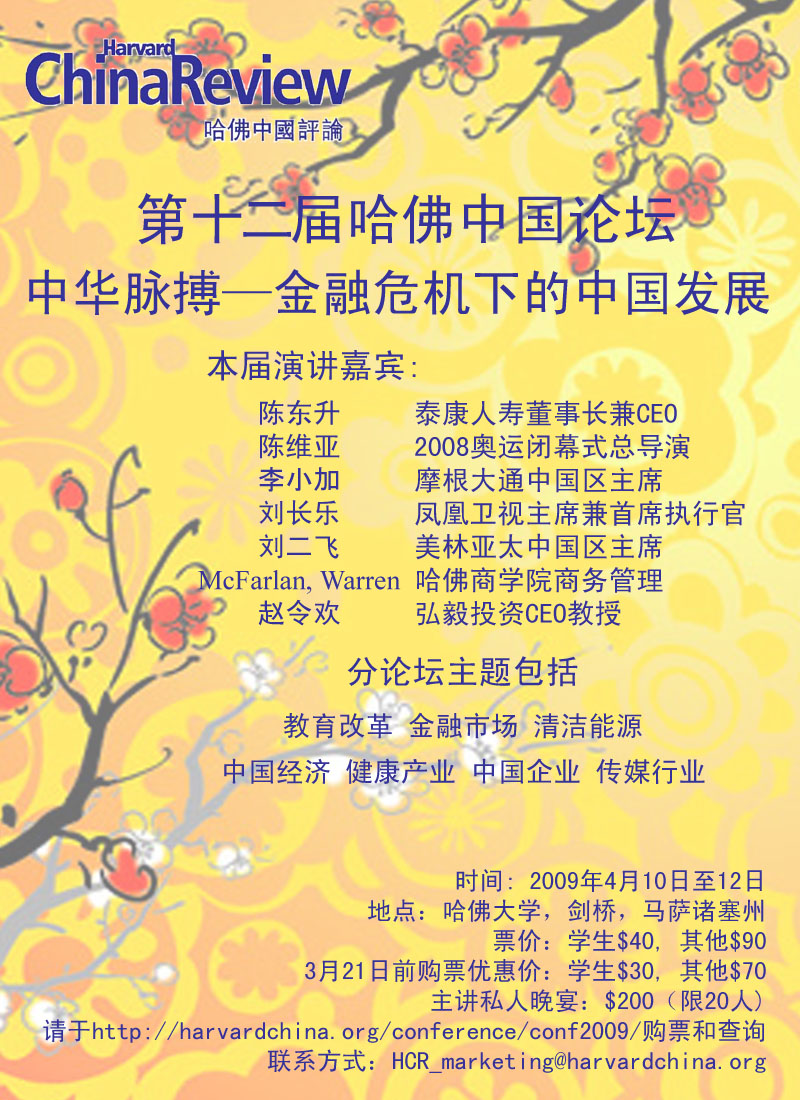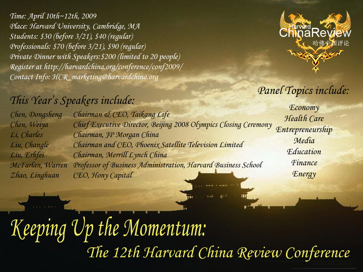 Subject: Harvard China Review 2009, Fri. 4/10 - Sun. 4/12