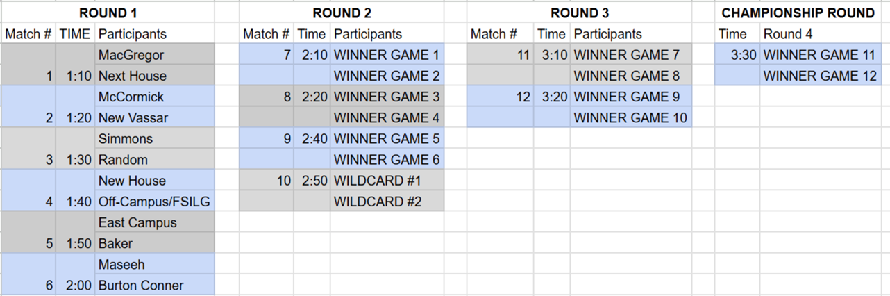 2. Tug of War Tournament! See the bracket below for your dorm's scheduled time for the first match!