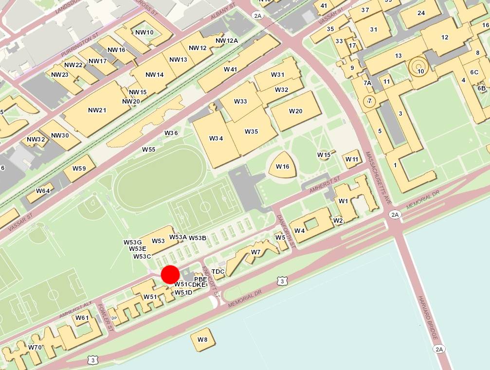 We are in Burton-Conner dormitory this week, in the large multipurpose room named the Porter Room. Please enter through the Burton-Conner front lobby, which is at the east end of the building facing Amherst Alley (not on the Memorial Drive side). Gina Han will be sitting at couch in the Burton-Conner lobby to let you into the dorm and point you toward the Porter Room. The front lobby entrance is at the red dot on the map below. (Burton-Conner is Building W51.)