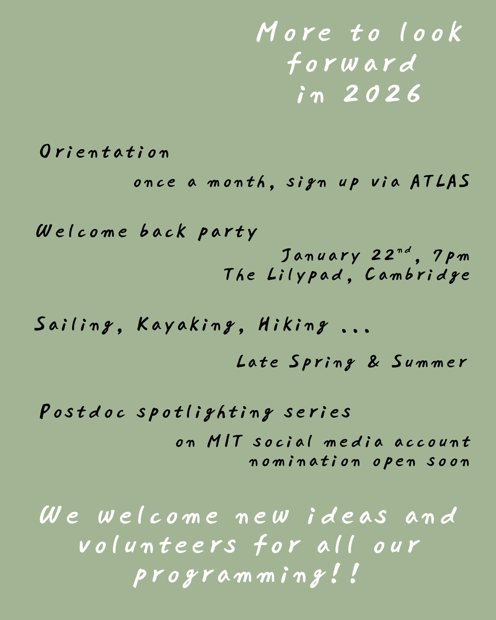 If you are interested, please sign up<https://docs.google.com/forms/d/e/1FAIpQLSeyVY8GluI91mzGXd8YQeOa0ZJokRSL28nOS-9kAsigiROvWQ/viewform> for our Welcome Back Party, 7-10pm on 1/22/2026 @ The Lilypad.