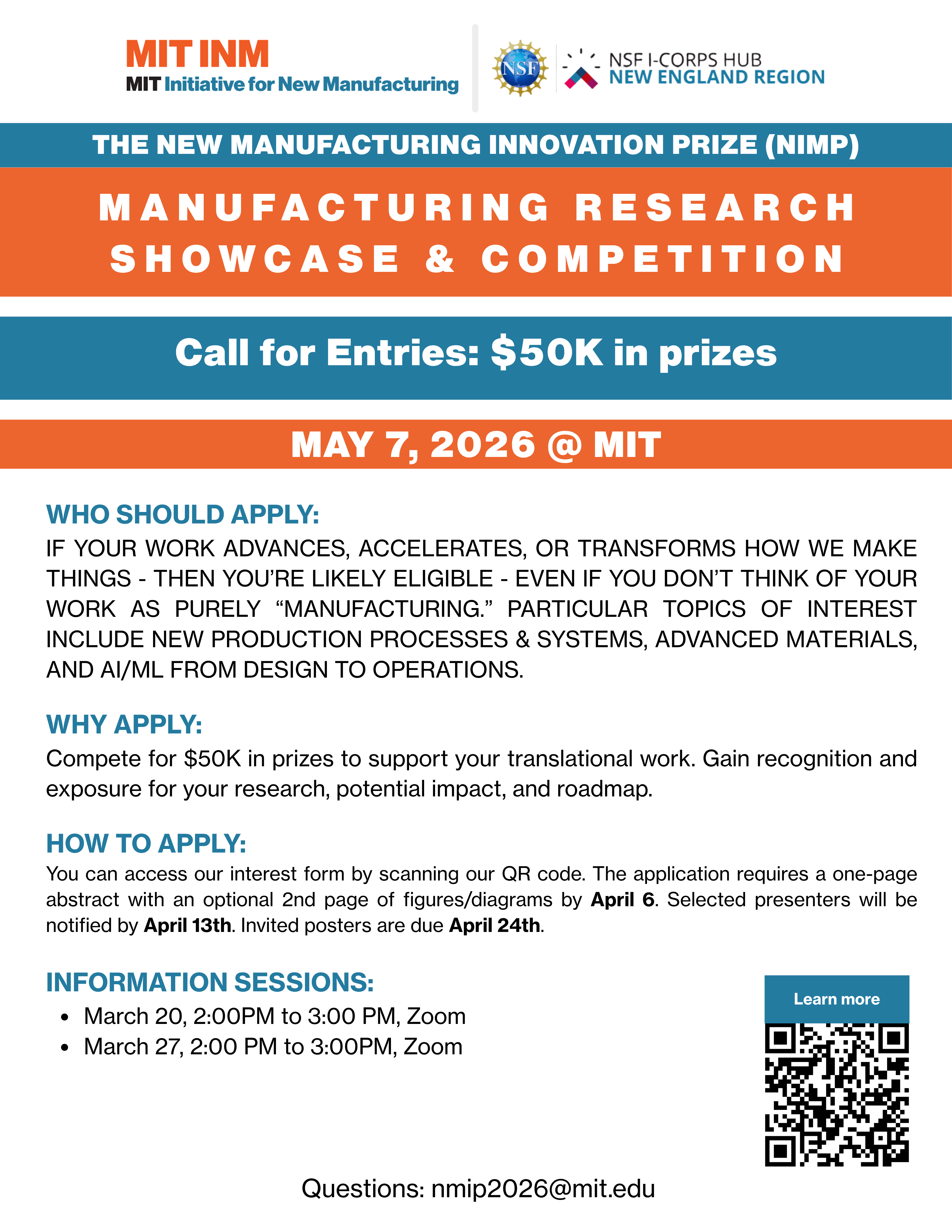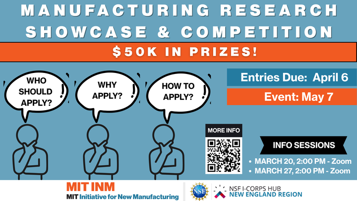 The New Manufacturing Innovation Prize (NMIP) is a flagship event of our inaugural May Manufacturing Week<https://inm.mit.edu/manufacturing-week/>, co-led by the MIT Initiative for New Manufacturing (INM) and the NSF I-Corps New England Hub.