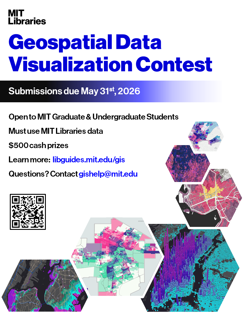 MIT Libraries' Research Data Services invites you to submit a poster for our Geospatial Data Visualization Contest. Undergraduate and graduate students of all skill levels are encouraged to submit. If you are graduating in the Spring 2026 semester, you are still eligible to apply!