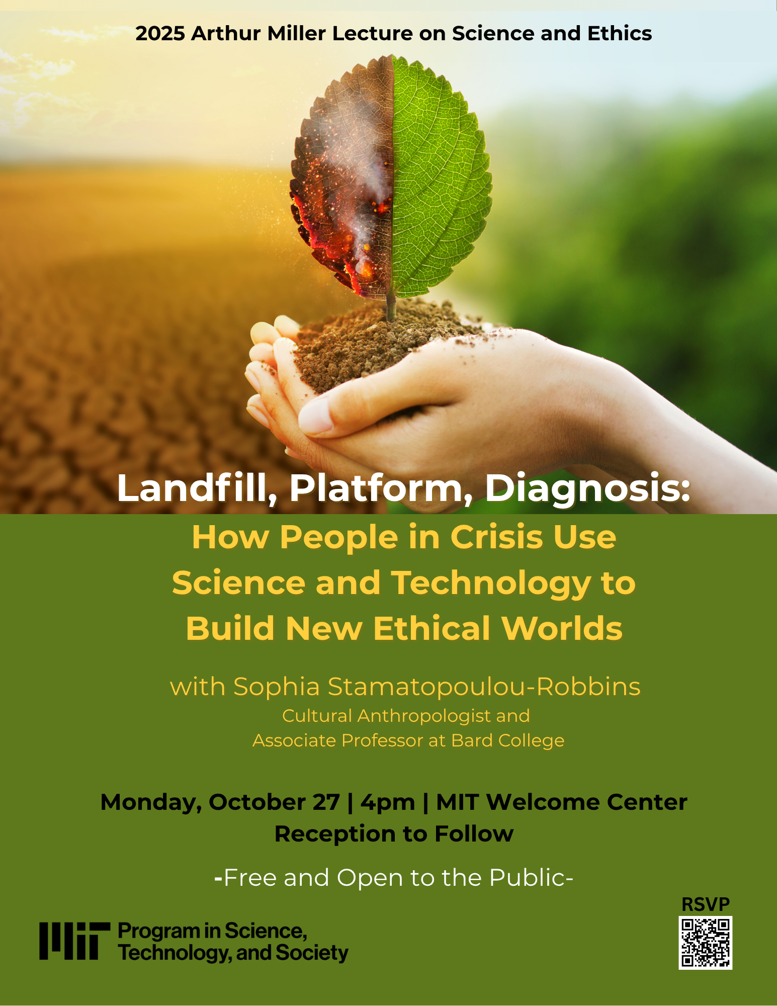 The Program in Science, Technology, and Society invites you to the annual Arthur Miller Lecture in Science and Ethics on Monday, October 27th at 4:00 pm in the MIT Welcome Center, featuring Sophia Stamatopoulou-Robbins<https://www.bard.edu/faculty/sophia-stamatopoulou-robbins>, Anthropologist and Associate Professor at Bard University, as she speaks about technological advances and the ingenuity of humankind in times of turmoil or distress.