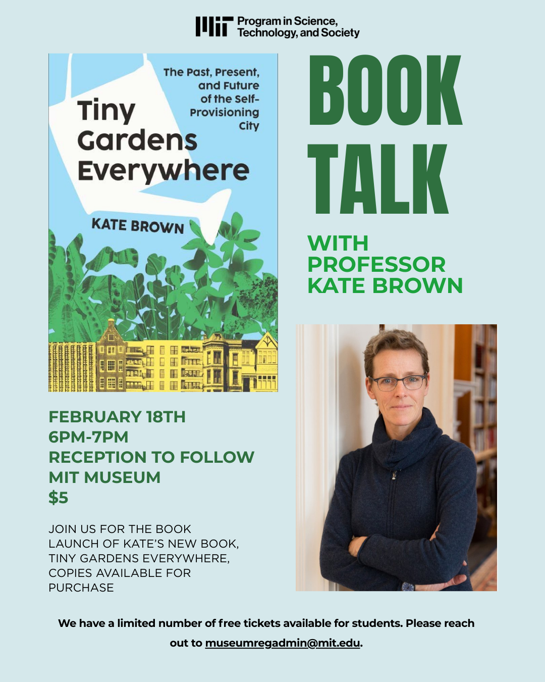 This is a reminder that the Program in Science, Technology, and Society invites you next Wednesday, February 18th, from 6-7 pm at the MIT Museum, for a special talk by Professor Kate Brown on her new book: Tiny Gardens Everywhere<https://wwnorton.com/books/9781324105831>.