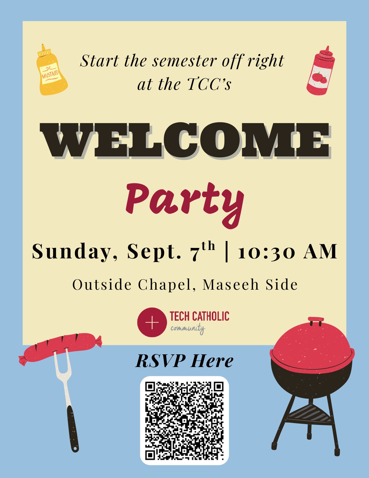 We want to celebrate the start of the Fall Semester with all of you, whether you're returning to campus or joining us for the first time. On September 7 celebrate the Eucharist with us at the 9:30 am Mass. Afterwards at 10:30 am, we will have our Welcome Party for the Fall Semester. Come join us outside the Chapel (Maseeh side) to catch up with your friends while meeting new ones! We will have delicious BBQ style food and lawn games.