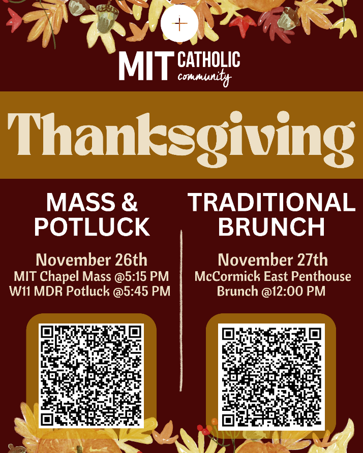 I hope you are all enjoying the semester so far! Here is just another reminder that the MIT Catholic Community would love to celebrate Thanksgiving with you! If you will be on campus, join us for Mass, a potluck, and a brunch:
