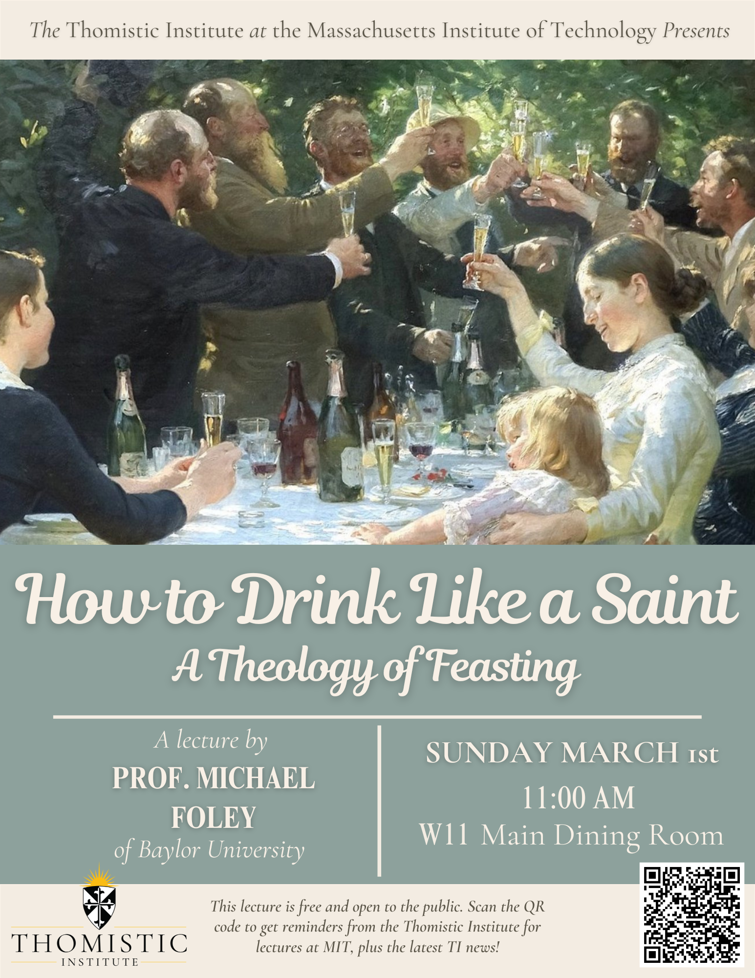 On Sunday, March 1st, at 11 AM in the W11 Main Dining Room, we will be having a Thomistic Institute (TI) lecture titled How to Drink Like a Saint: A Theology of Feasting given by Prof. Michael Foley from Baylor University! Please RSVP<https://docs.google.com/forms/d/e/1FAIpQLSfyNUrzAPcAWw2hfpJf85HEwaV7edfg5cqYYFmUgknepSx5Gw/viewform> if you would like to attend. Below (and in the attached poster) are more details. Thanks; we hope you can make it!